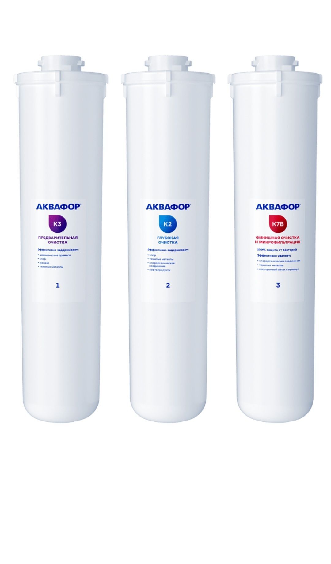 Комплект Аквафор "К3-К2-К7В", состоящий из трех сменных модулей, обеспечивает глубокую очистку воды. Отлично очищает мягкую воду от всех вредных примесей, в том числе хлора, органических соединений и бактерий. Подходит для фильтра Аквафор "Кристалл. Эко". Модуль (К3): глубокая фильтрация растворенных примесей до 5мкм Модуль (К2): финишная сорбция растворенных примесей до 3 мкм Модуль (К7В): глубокая сорбционная очистка, отделение бактерий и цист, ультрафильтрация. Комплектация 3 сменных модуля: К3 - 1 шт. К2 - 1 шт. К7В - 1 шт.